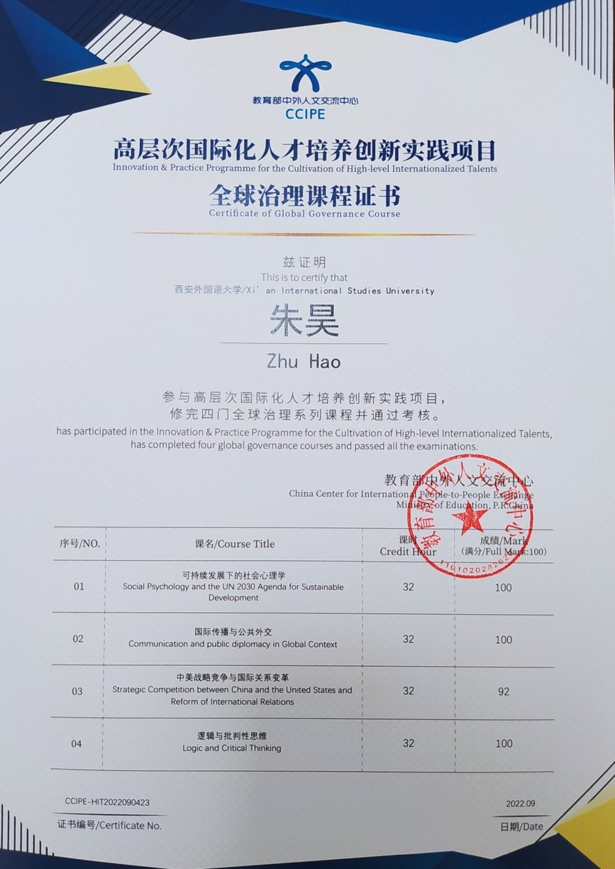 2022年9月,国际关系学院19级卓越外交人才实验班朱昊同学参加教育部中外人文交流中心“高层次国际化人才培养创新实践项目”,修完全球治理系列专题规定课程并通过考核,获得嗨皮漫画 参加该项目第一张课程证书。